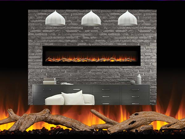 Plexus electric fireplaces offer a large linear transitional design with a smoked crystal ember bed and driftwood log accents. Impressive dual colored flame appearance combined with multi-color ember bed lighting and mood enhancing ceiling lighting.